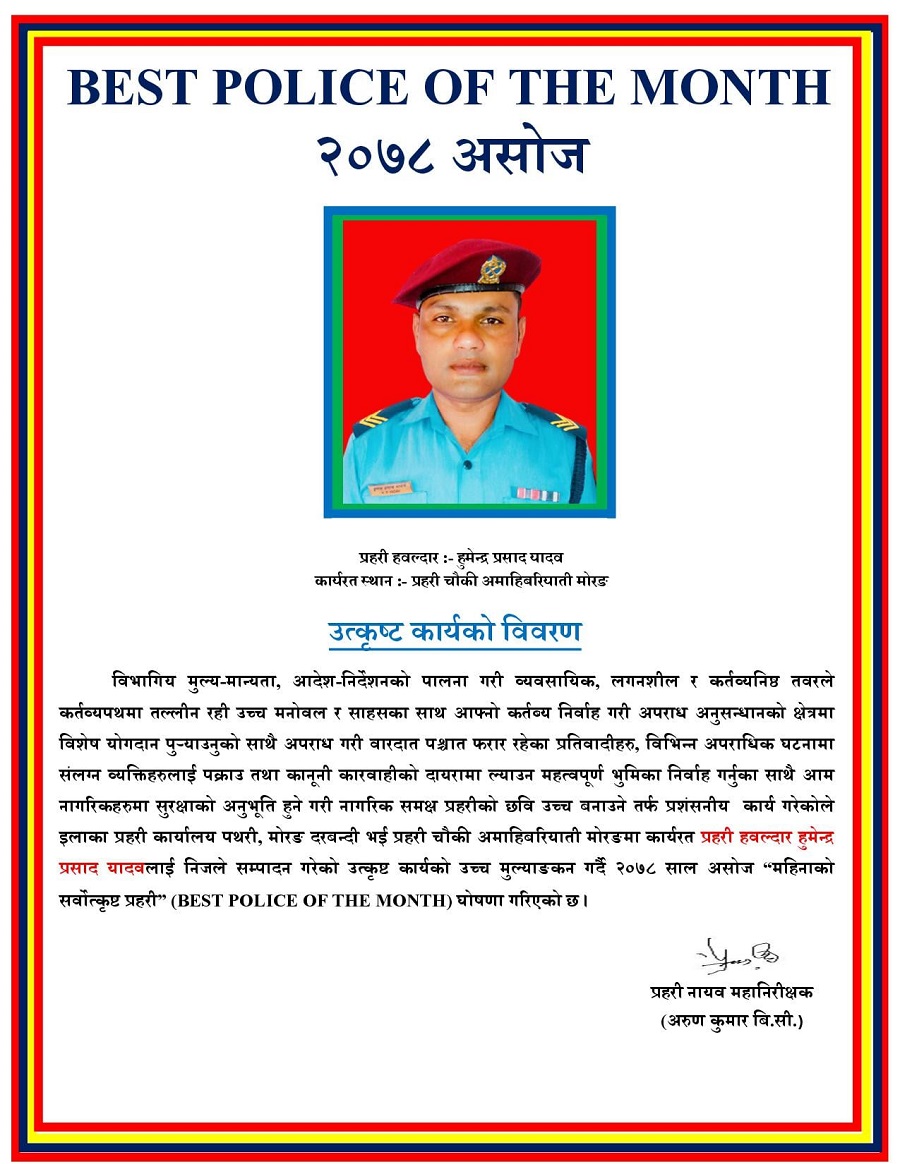 विराटनगर । इलाका प्रहरी कार्यालय पथरी, मोरङ दरबन्दी भई प्रहरी चौकी अमाहिबरियाती मोरङमा कार्यरत प्रहरी हवल्दार हुमेन्द्र प्रसाद यादव असोज महिनाको सर्वोत्कृष्ट प्रहरी (बेस्ट पुलिस अफ द मन्थ ) घोषित भएका छन् । विभागिय मुल्य-मान्यता, आदेश-निर्देशनको पालना गरी व्यवसायिक, लगनशील र कर्तव्यनिष्ठ तवरले क�. . .