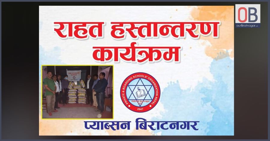 विराटनगर। प्राइभेट बोर्डिंग स्कुल एसोसिएसन (प्याब्सन बिराटनगर) ले विपद् व्यवस्थापन समिति मोरंगका संयोजक एवम् बिराटनगर महानगरका सहायक सिडिओ महेशराज तिम्सिना, जिल्ला प्रहरी कार्यालय मोरंगलाई गत साता आएको बेमौसमी बाढीबाट क्षतिग्रस्त क्षेत्रमा वितरण गर्नका लागि खाद्यान्न का सामाग्रीहरु राहत स्वर. . .