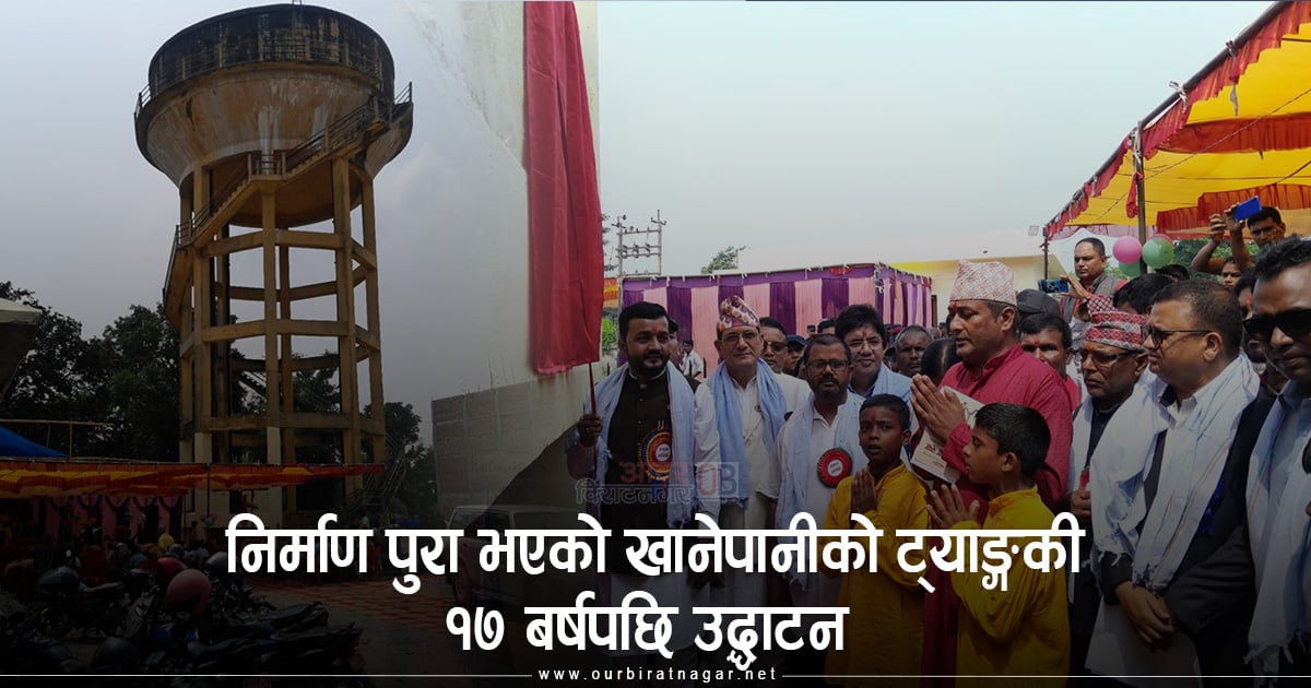 विराटनगर । विराटनगर १४ स्थित जतुवामा १७ बर्ष अगाडी निर्माण गरिएको खानेपानी ट्याङ्गकीको खानेपानी मन्त्री प्रदिप यादवले उद्धाटन गरेका छन् । १७ वर्ष अगाडी निर्माण कार्य पुरा भएता पनि औपचारीक रुपमा उद्धाटन गरिएको थिएन । यसैविच बुधबार एक कार्यक्रम विच खानेपानी ट्याङ्कीका संघीय सरकारका खानेपानी मन्त्. . .