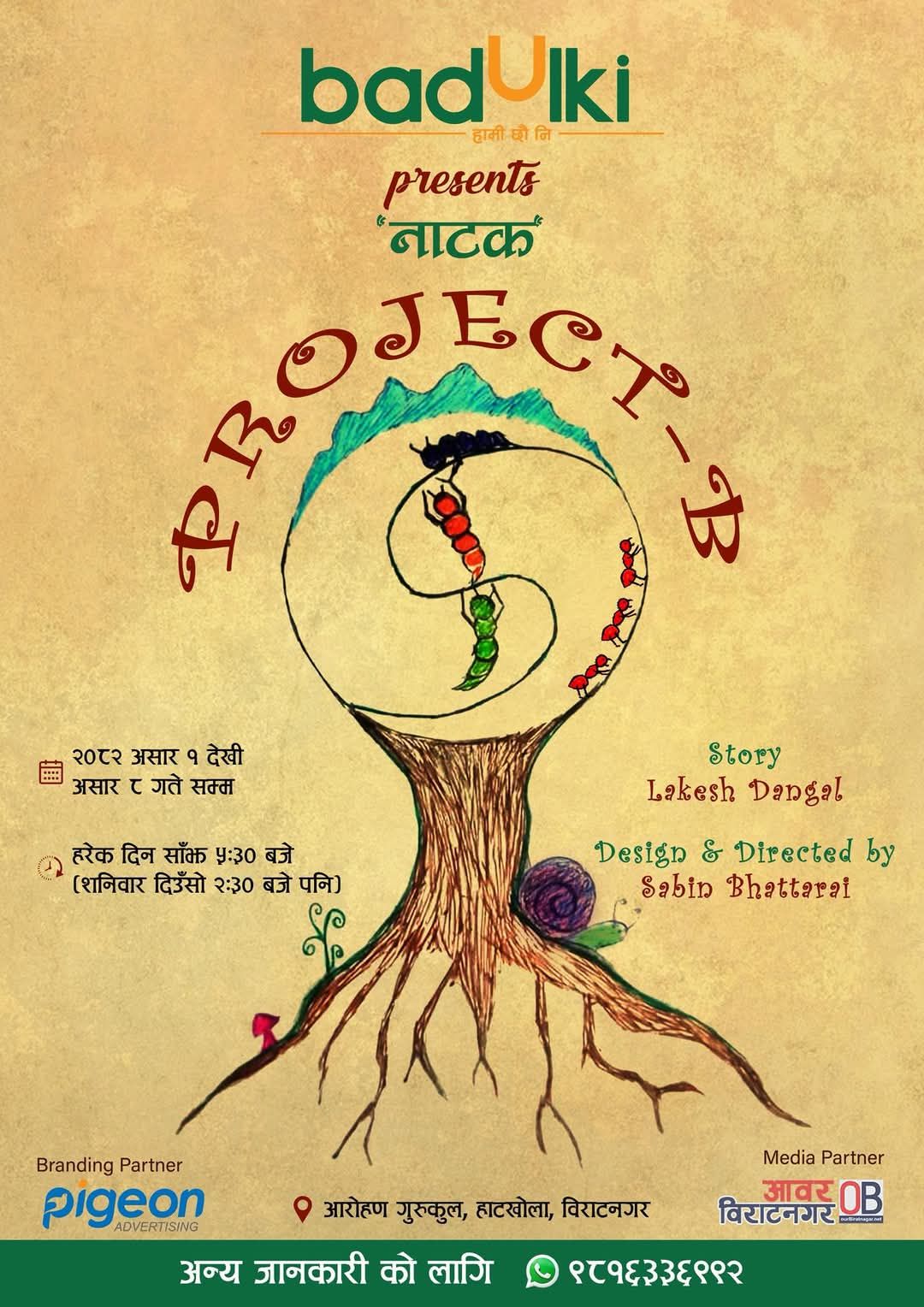 विराटनगर । विराटनगरको हाटखोला स्थित आरोहण गुरुकुलमा"प्रोजेक्ट बी" नामक नाटकको मञ्चन हुने भएको छ। यो नाटक सपना देख्नेहरू र आफूमाथि विश्वास गर्नेहरूको कथामा आधारित रहेको आयोजकले जनाएको छ। कार्यक्रम संयोजक लकेश दंगालका अनुसार यो नाटक हरेक उमेरका दर्शकहरूका लागि प्रभावकारी, उत्प्रेरणामूलक र मनोरञ्ज�. . .