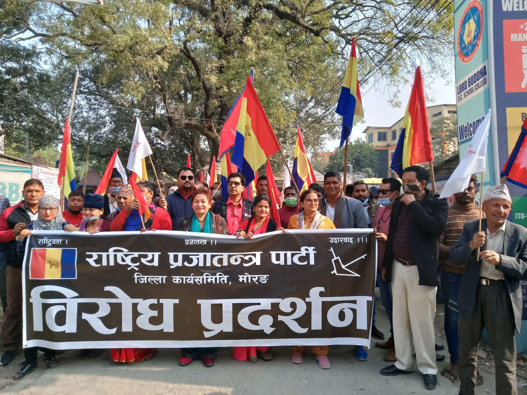 विराटनगर । राष्ट्रिय प्रजातन्त्र नेपाल मोरङ कार्यसमितिले संवैधानिक राजतन्त्रसहितको व्यवस्था कायम गर्न माग गर्दै विराटनगरमा विरोध प्रदर्शन गरेको छ । संवैधानिक राजतन्त्र, हिन्दु राज्यसहितको माग गर्दै राप्रपा मोरङले आइतबार विरोध ¥याली निकालेको हो । शनसारीमाईंस्थानबाट निकालिएको ¥याली जिल्ला प्रश. . .