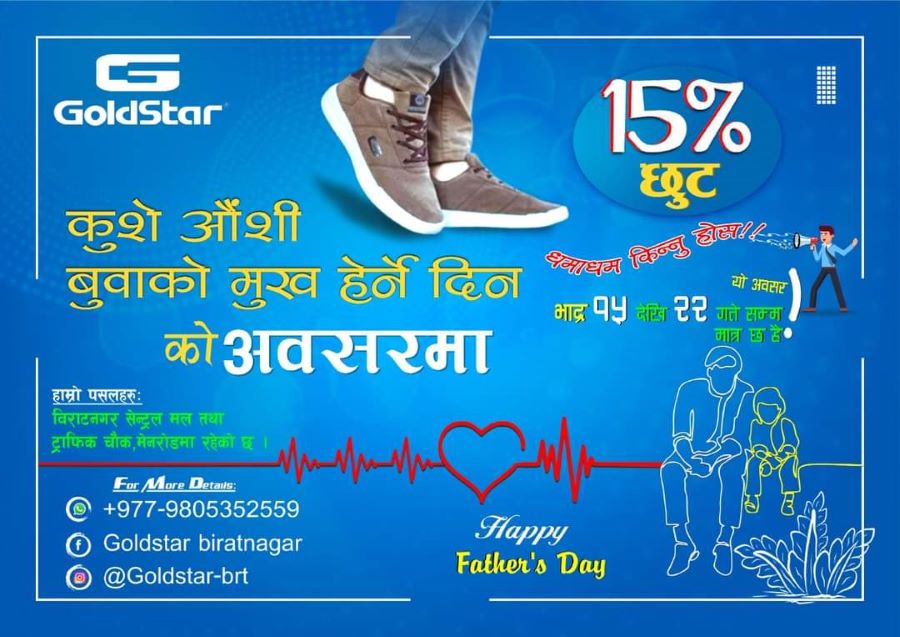 विराटनगर कुशेऔंशी तथा बुवाको मुख हेर्ने दिनको अवसरमा गोल्डस्टार जुत्ता बिराटनगरका शाखाहरुमा विशेष छुटको व्यवस्था गरिएको छ। विराटनगरको सेन्ट्रल मल र ट्राफिक चोकमा भएका गोल्डस्टारका दुवै शाखाहरुमा कुशेऔंशीको शुभ अवसरमा हरेक जुत्ताको खरिदमा १५ प्रतिशत छुटको व्यवस्था गरिएको हो। कुशेऔंशीलाई लक�. . .